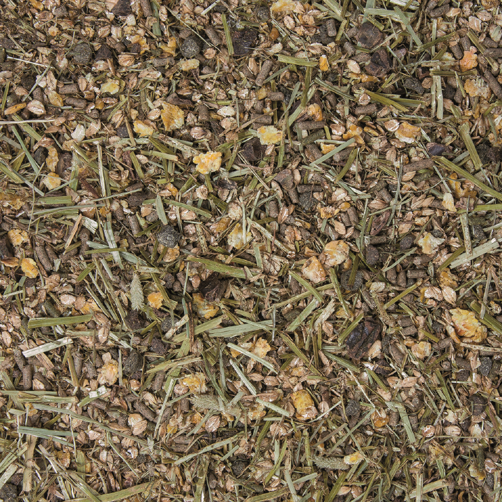 Gerstvlokken, cornflakes, zonnebloempitten, 8% alfalfa, zonnebloemmeel, tarwezemelen, johannesbroodmeel, 3% timotheegras, appelpulp, calciumcarbonaat, cichoreipulp, biergist, lijnolie, gerst, natriumchloride, monocalciumfosfaat, lijnzaadkoek, zonnebloemolie, magnesiumoxide