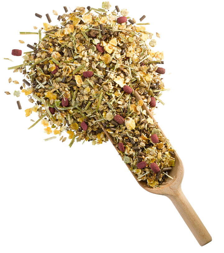 Gerstvlokken, cornflakes, appelpulp, vlasmeel, erwtenvlokken, alfalfahooi, biergist, lijnolie, stroop, biet, calciumcarbonaat, calciumfosfaat, magnesiumfumaraat, magnesiumoxide