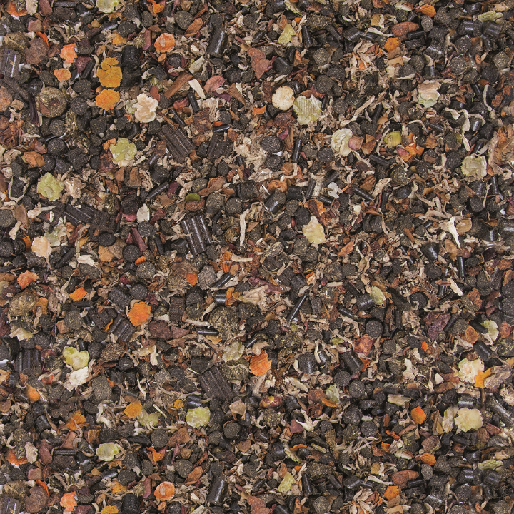 30% luzerne, zonnebloemschillen, zonnebloemmeel, 11% appelpulp, lijnzaadkoek, 4,6% erwtenvlokken, lijnolie, zoete lupinevlokken, cichoreipoeder, natriumchloride, 1% geïnactiveerde biergist, monocalciumfosfaat, magnesiumoxide, calciumcarbonaat, wortelen, brandnetelbladeren